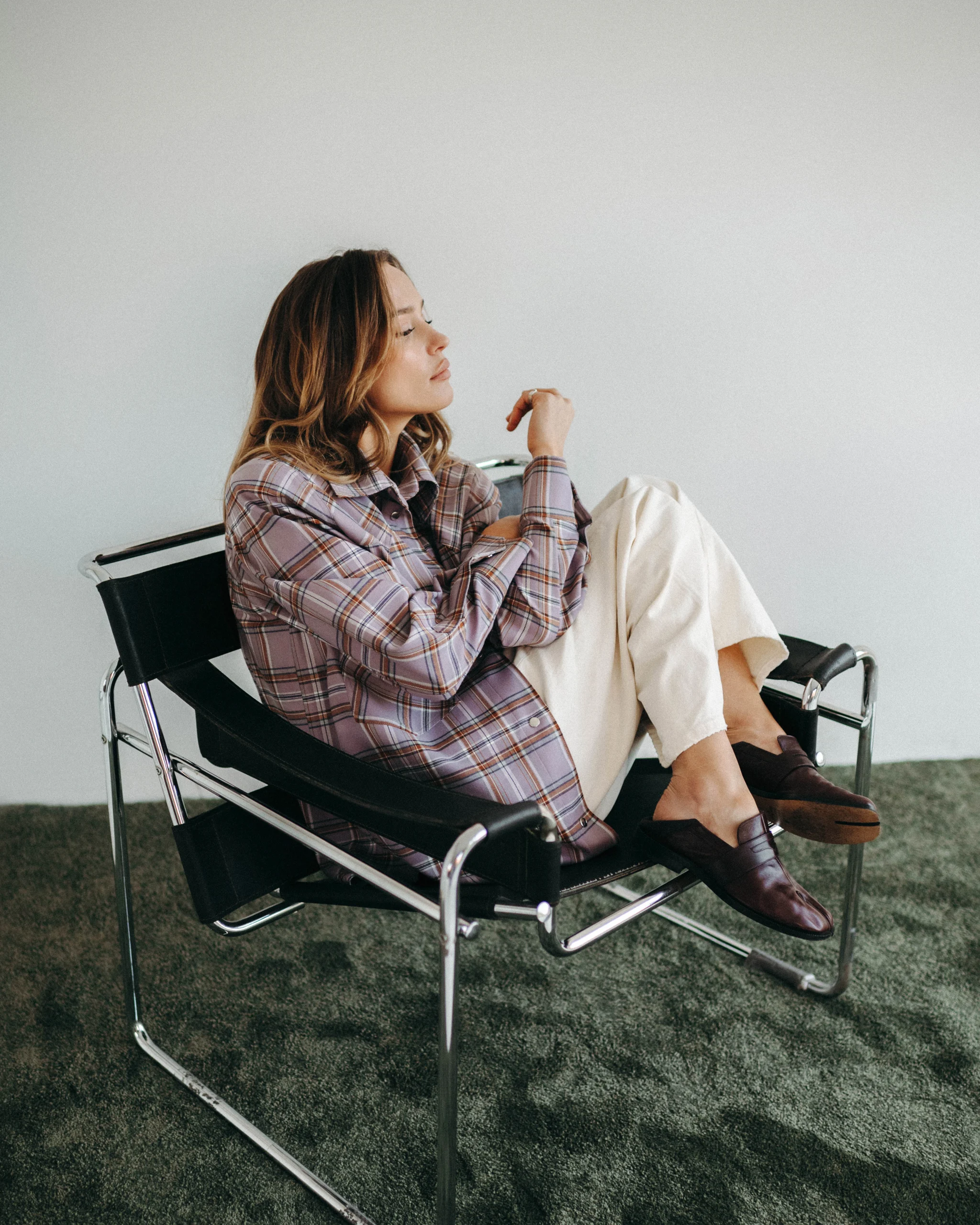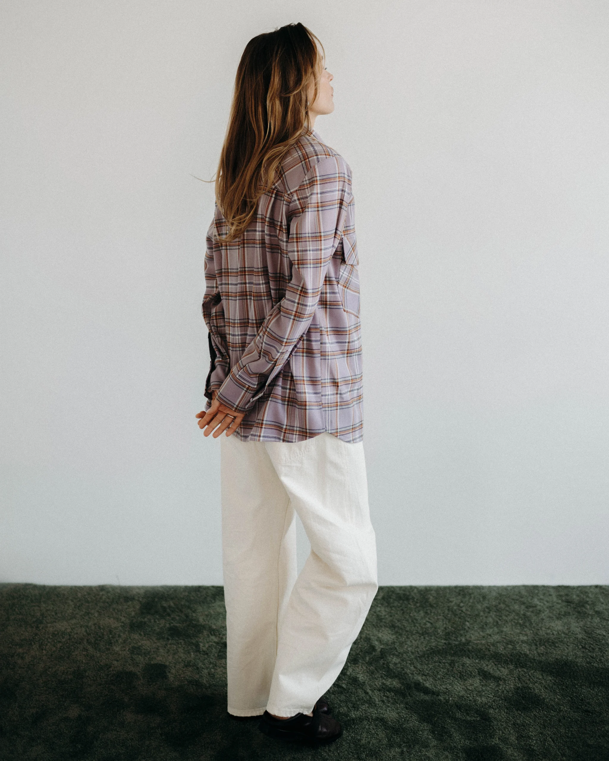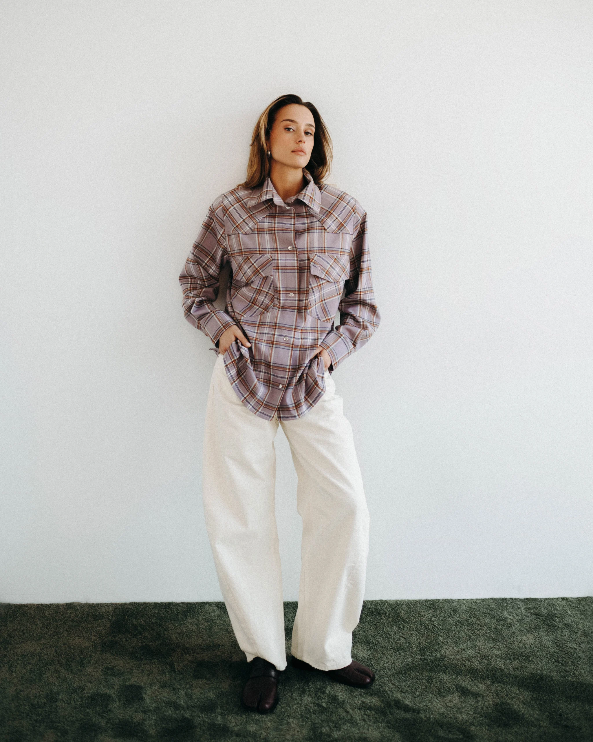 Tiesaus kirpimo, pailginto silueto, laisvomis rankovėmis languoti marškiniai, užsegami spaudėmis priekyje. Priekyje minimalistinės kišenės su paulesstudio logotipu. Svarbiausias akcentas – petukai.