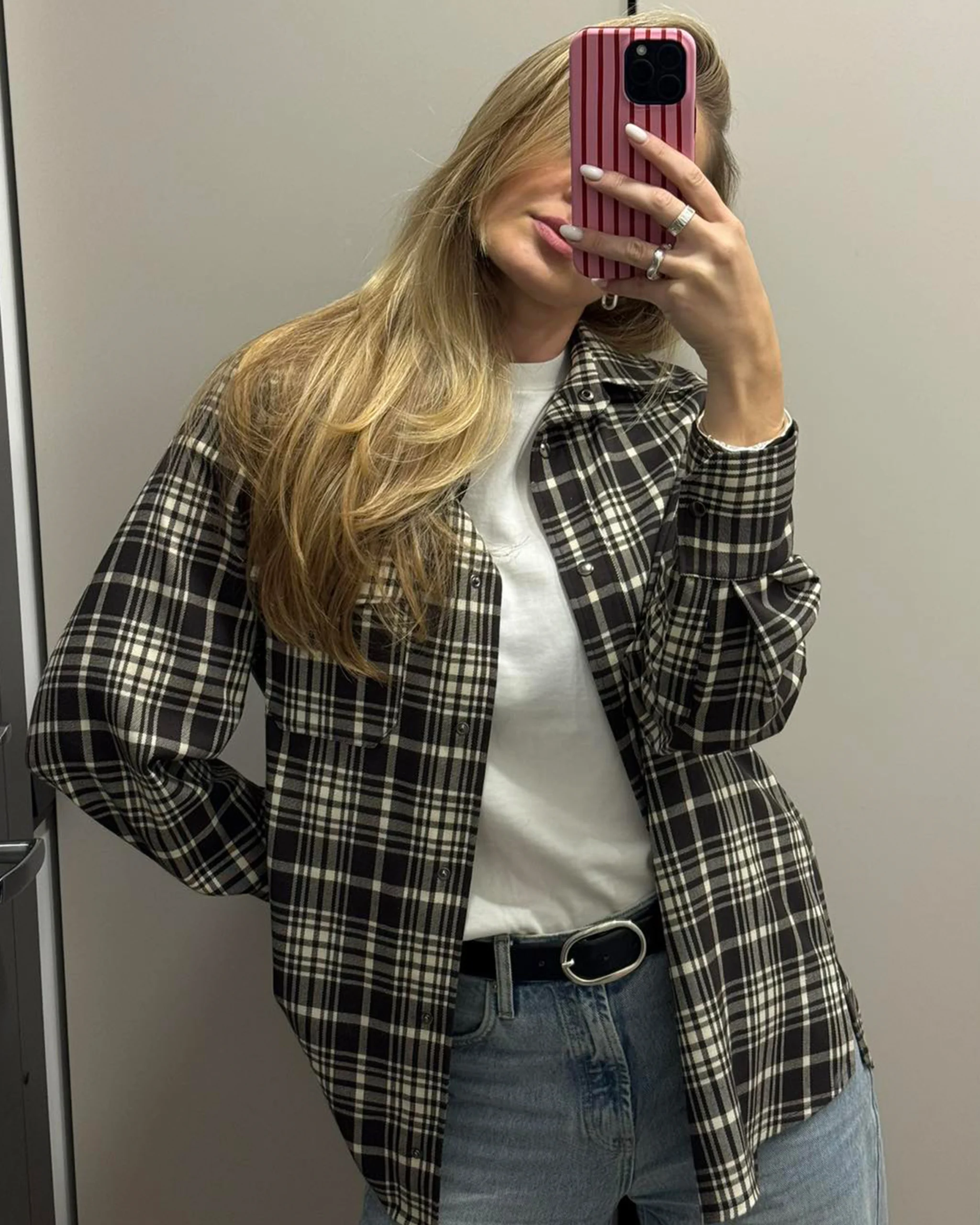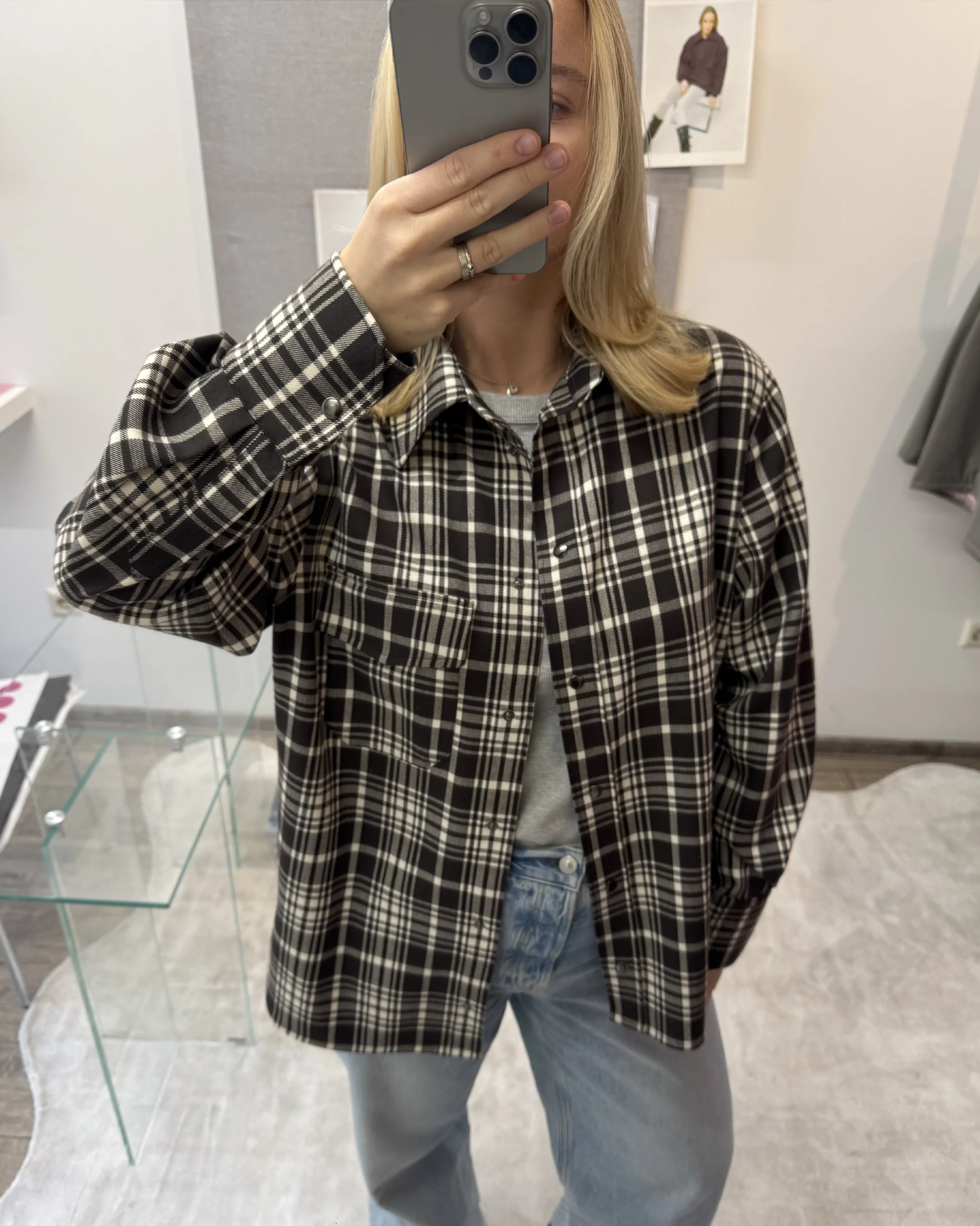 Didinto kirpimo, laisvo silueto languoti marškiniai, užsegami spaudėmis priekyje. Priekyje minimalistinė kišenė.