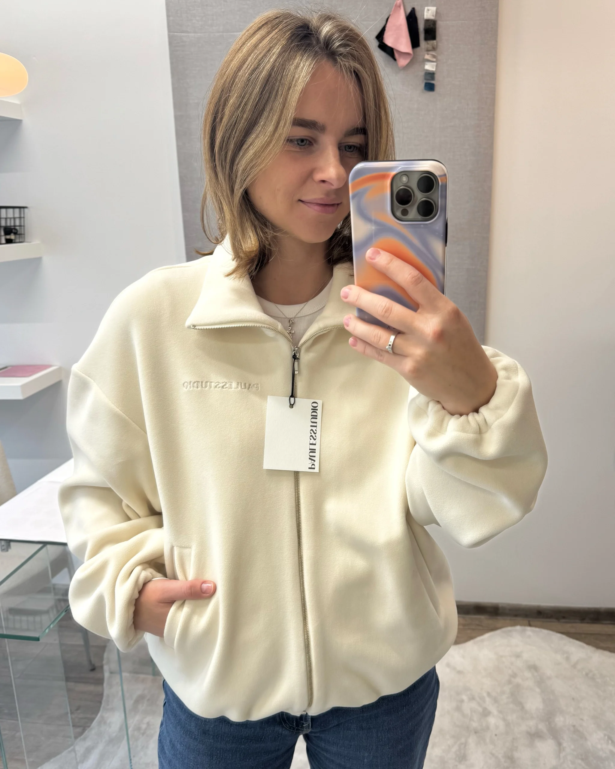 Užtraukiamas klasikinis džemperis  pasiūtas iš fliso audinio. Su siuvinėtu minimalistiniu logotipu priekyje. Šoninės vertikalios kišenės, užtrauktukas per visą megztinio ilgį, reguliuojami rankogaliai ir džemperio apačia.